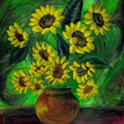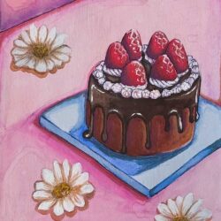 I love the perspective in this image. Looking at the objects from above is a different but lovely approach. The colours are appealing, and the contrasts between the yellow lemons, deep pink flowers and the blue and white of the crockery are eye-catching and dramatic. It’s a lovely work. ‘